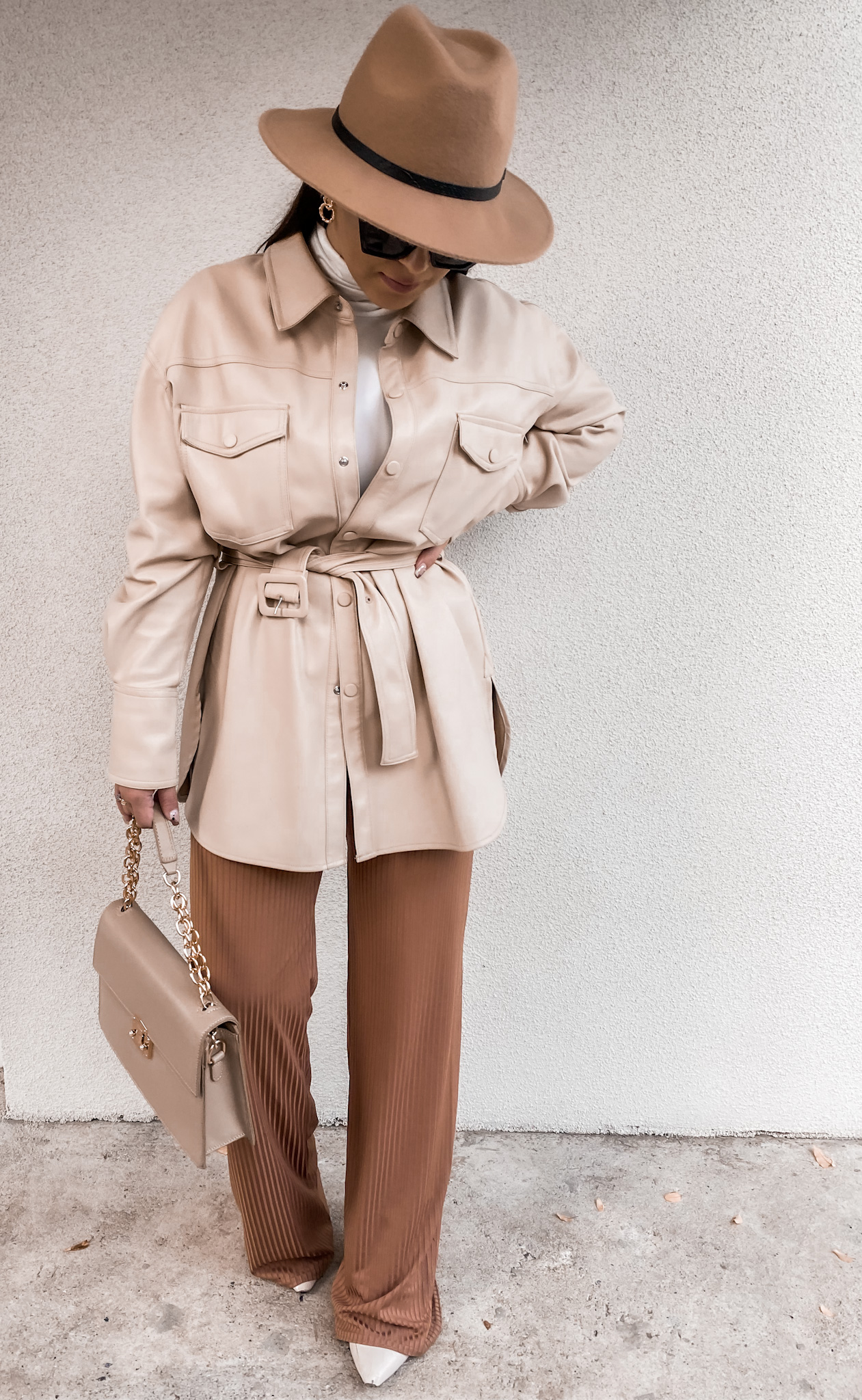 Sety dostępne są w kilku kolorach, ja zdecydowałam się również na czarny :) Od dawna lubiłam szerokie spodnie, jednak w ostatnim czasie są zdecydowanie moim numerem 1 ! Pięknie podkreślają kształty i można je łączyć na duuuużo różnych sposobów. Genialnie sprawdzają się w stylizacjach na większe wyjścia oraz tych codziennych. Kolejnym must have tego sezonu jest koszula wierzchnia typu oversize. W sklepach mnóstwo tych w kratę(i takie oczywiście też mam w swojej szafie) jednak ja tym razem postawiłam na eko skórę. Do tego klasyczny, biały basicowy golf (jako baza) , dodatki i look gotowy. Kapelusze ! Mało ich na ulicach, jednak ja jesienią staram się z nimi nie rozstawać :) ah ! No i odważny BIAŁY BUT ;-) zwykle białe kozaki są kojarzone z tandeeeetą ... Wg mnie wszystko zależy od całości ;-) Widzę ich coraz więcej na ulicach, co cieszy!